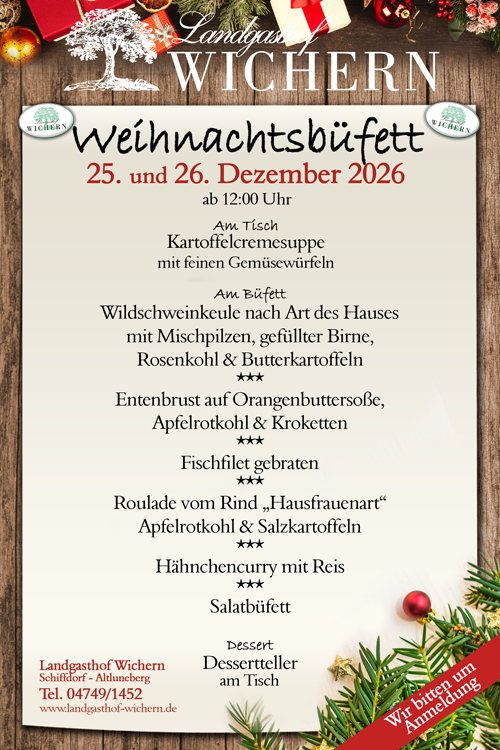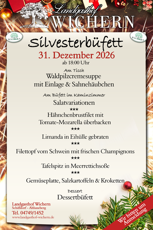 Silvester im Landgasthof Wichern. Eine bezaubernde Speisenauswahl wartet auf Sie bei unserem traditionellen Silvestermenü. Wir freuen uns auf Ihre Reservierung.