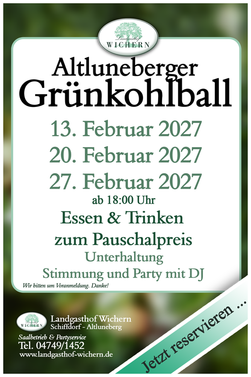 Altluneberger Grünkohlball am 13. Februar, 20. Februar und 27.Februar 2027. Essen & Trinken zum Pauschalpreis. Stimmung und Party mit DJ. Wir freuen uns auf Ihre Reservierung.